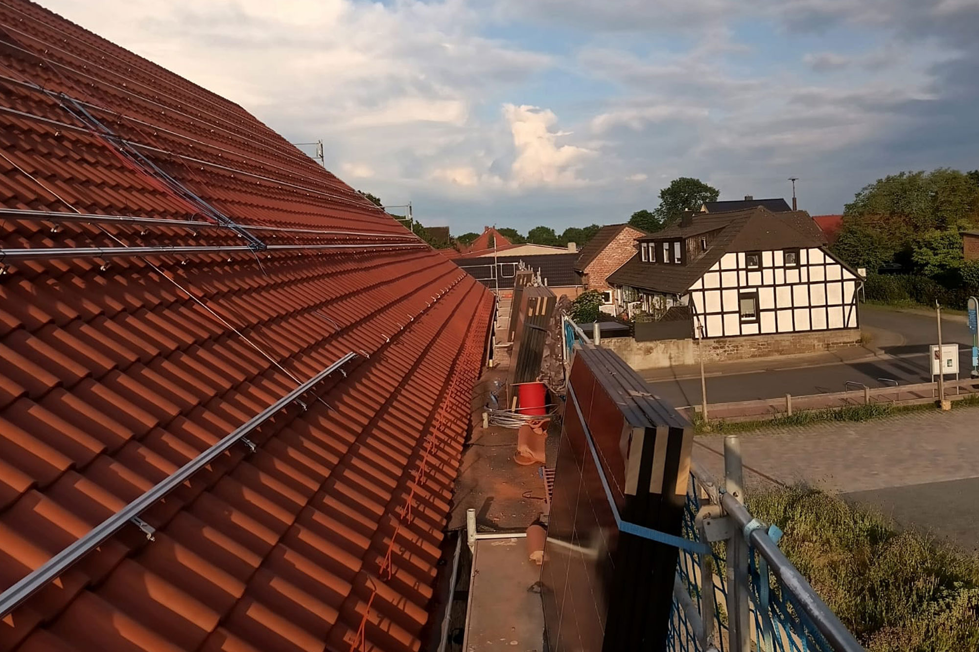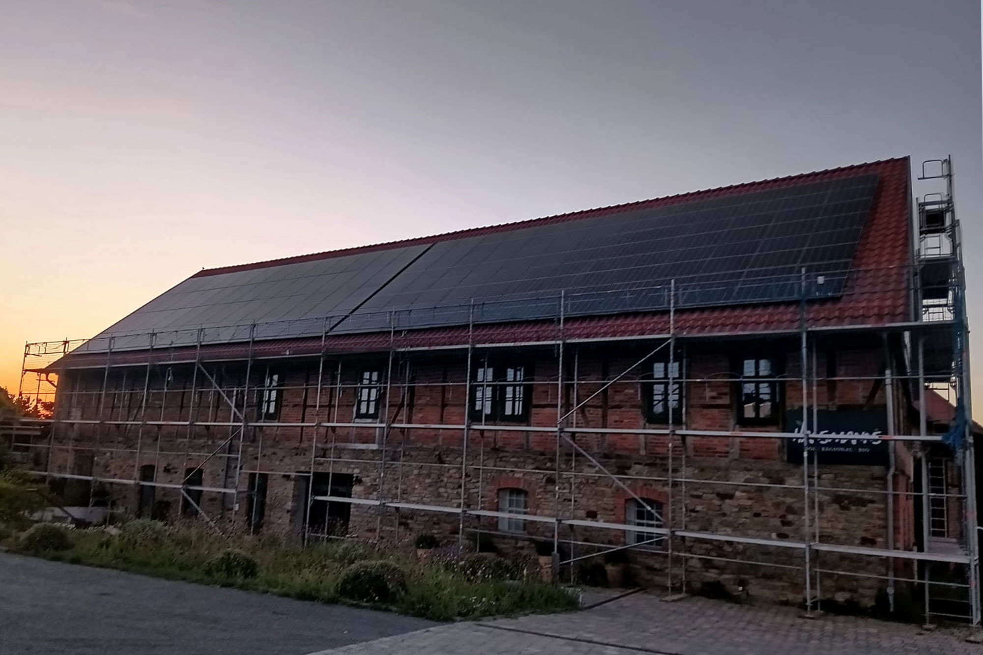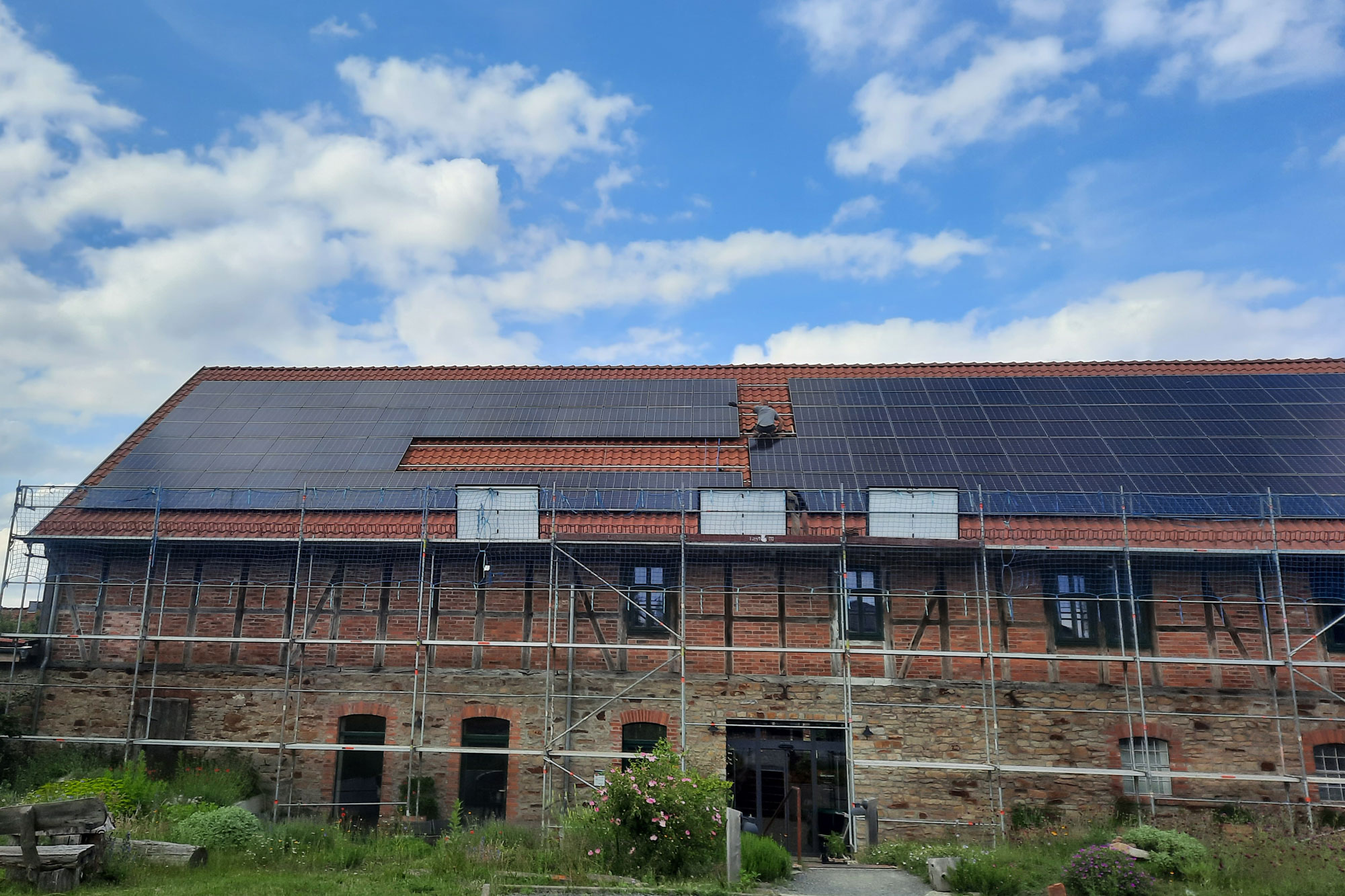Etwa 150 JinkoSolar-Module wurden im Winter/Frühjahr 2025 auf den südlichen Flachdachflächen der Halle aufgeständert. Zwei direkt auf dem Dach montierte Huawei-Wechselrichter sorgen dort für die direkte Versorgung der Halle. Betreiber ist die Energiegenossenschaft Braunschweiger Land eG.