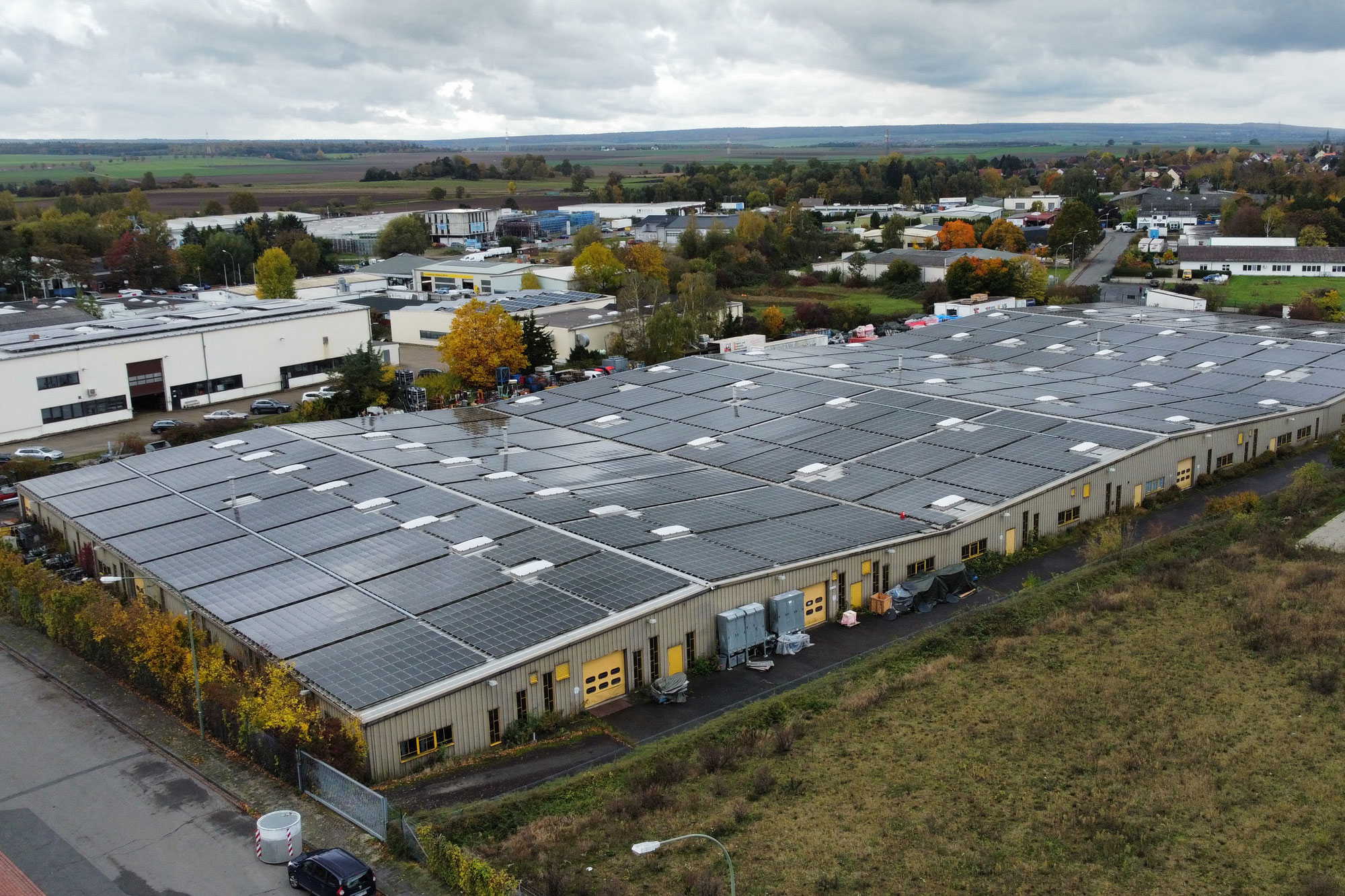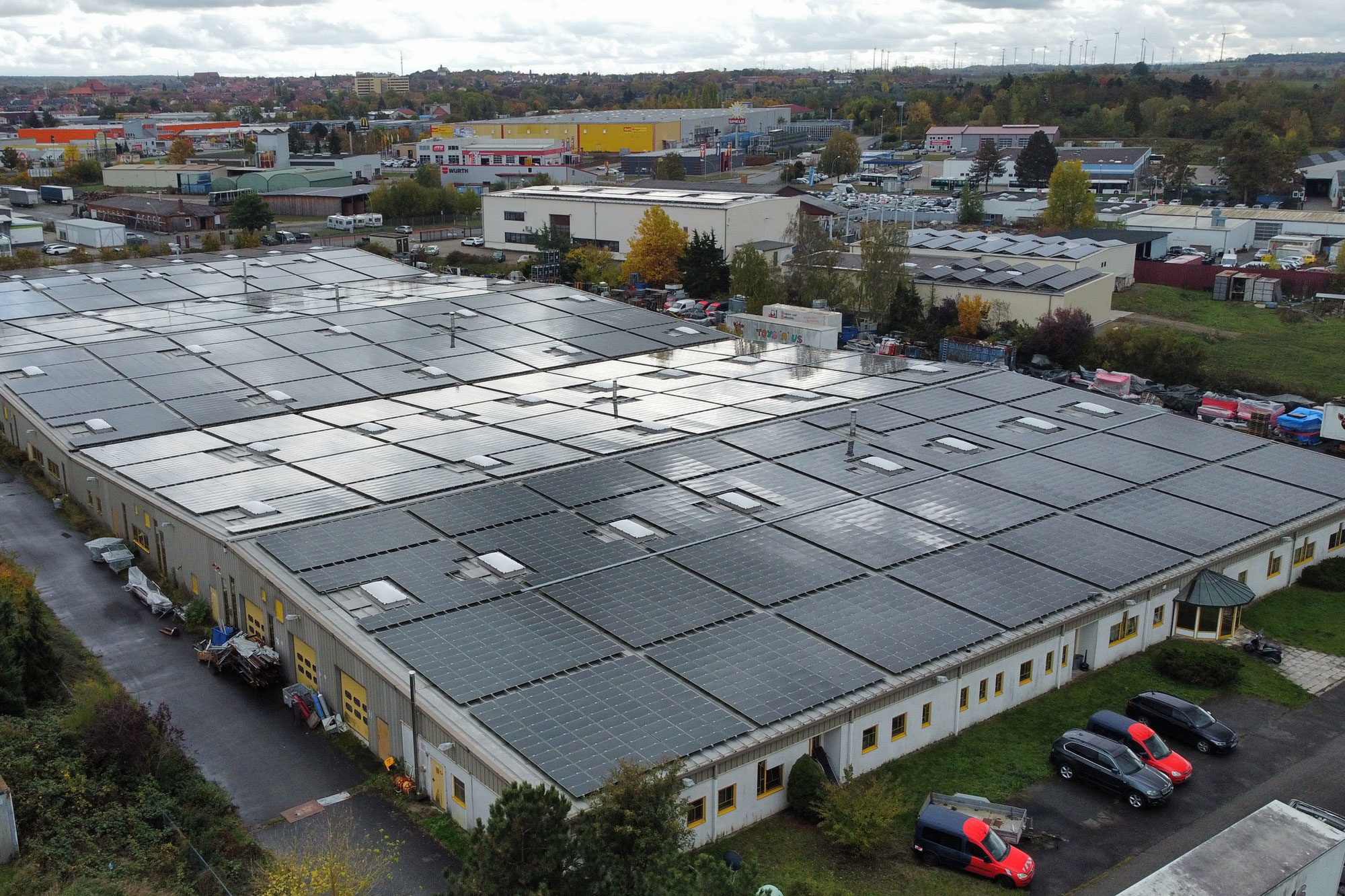 Etwa 150 JinkoSolar-Module wurden im Winter/Frühjahr 2025 auf den südlichen Flachdachflächen der Halle aufgeständert. Zwei direkt auf dem Dach montierte Huawei-Wechselrichter sorgen dort für die direkte Versorgung der Halle. Betreiber ist die Energiegenossenschaft Braunschweiger Land eG.